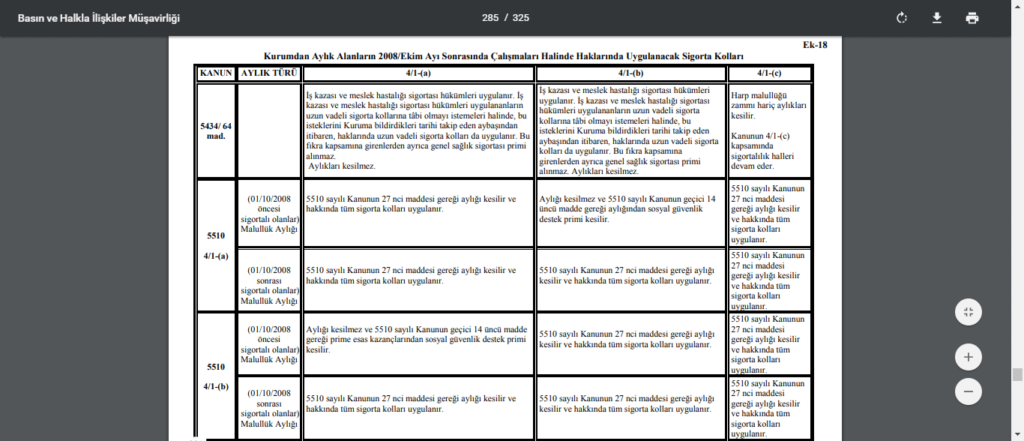 Bu tablolar Sosyal Güvenlik Kurumunun 2011/58 sayılı Sigortalıların Tahsis İşlemleri konulu genelgede yer alan Ek-18’den aynen alınmıştır.